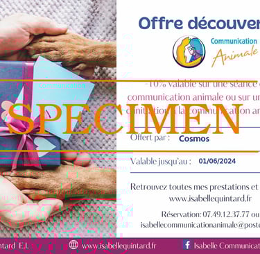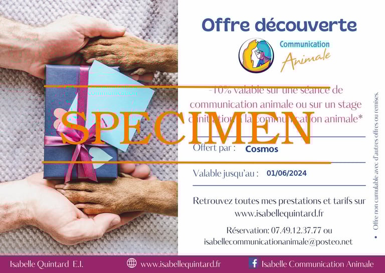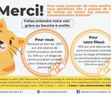 A compter de juin 2024, je vous envoie une carte nominative "offre découverte" suite à la séance de communication ou au stage en communication animale que vous venez de réaliser.