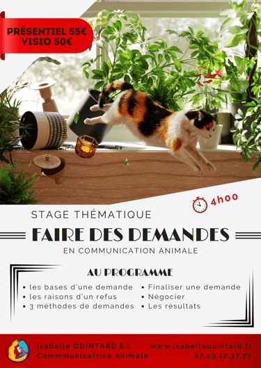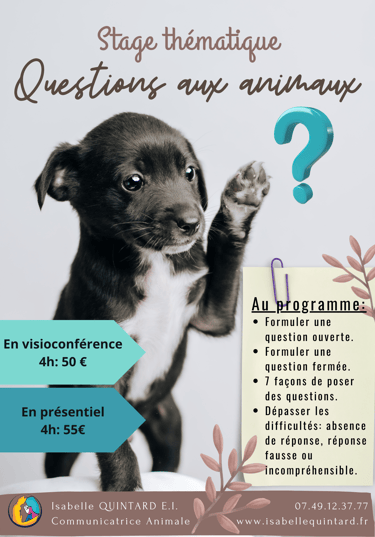 Un stage thématique pour vous permettre d'approfondir certains aspects de la communication animale. Dans chaque thème vous testez de nombreux exercices afin de trouvez l'approche qui fonctionne le mieux pour vous!